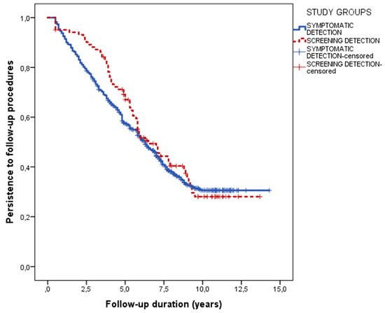 Persistence in the follow-up procedures was also similar between the two groups, with a median follow up of 6.5 years (95% confidence interval 5.1–7.9) in screening-detected and 6.3 years (95% confidence interval 5.7–6.9) in clinically detected patients (p = 0.452) (Figure 2).