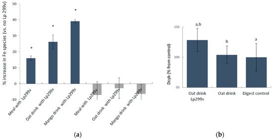 (a) Blue bars: percentage increase in ferric iron (Fe3+) and grey bars: insignificant changes (p < 0.05) in ferrous iron (Fe2+) in L. plantarum 299v supplemented meals, oat and mango drinks after simulated gastrointestinal digestion measured with differential pulse anodic stripping voltammetry (DPASV). Data are means ± SD, n = 3. An asterisk (*) indicates a significant difference from control (without L. plantarum 299v; p < 0.05). (b) Cellular level of the ferric reductase DCYTB was significantly increased (24%; p = 0.027) after a 4-h incubation with digested oat drinks containing L. plantarum 299v. DCYTB protein levels in cells (triplicate wells) were measured after 24 h from the first encounter. Data are means ± SD, n = 2. Letters a and b indicate significant differences (a: p = 0.032, b: p = 0.027).