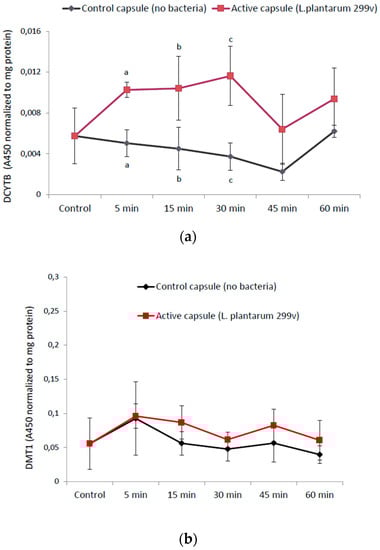 (a) Cellular level of the ferric reductase DCYTB was significantly increased in the presence of L. plantarum 299v (p = 0.0008 at 5 min, p = 0.03 at 15 min, p = 0.004 at t = 30 min) as indicated with letters a, b, and c. (b) Cellular expression of the iron importer DMT1 was not significantly increased in the time interval 5–60 min of incubation, as measured 24 h after the first encounter. Data are means ± SD, n = 3.