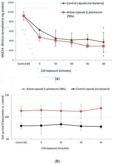 (a) Mucin production (MUC5AC) significantly decreased from baseline (control, no exposure to any capsules) in the presence of the capsules independent of L. plantarum 299v (from 0 to 60 min; p = 0.008 and p = 0.002 for control and active capsules, respectively). * indicates a significant difference from control; Data, shown as relative fluorescence units (RFU) normalized to total cell protein, are means ± SD, n = 3. (b) Total protein (proportional to cell number) shows that the decrease in mucus production is not caused by cell death.