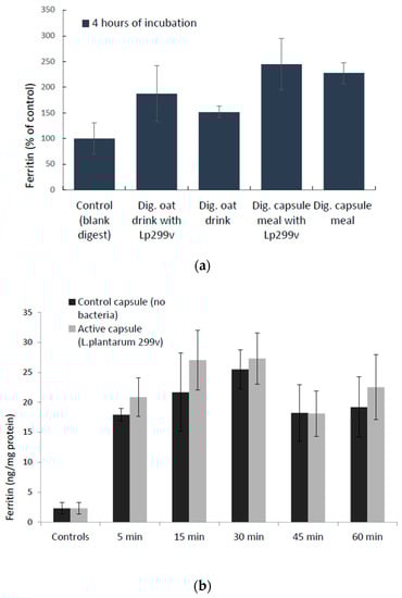 Caco-2/HT29 MTX cellular uptake of iron, estimated by measuring a proxy for iron uptake, ferritin, was not significantly increased due to the presence of L. plantarum 299v after a 4-h incubation with digested oat drinks (23%, p = 0.3) or a capsule meal (7%, p = 0.8). Nor did we observe a significant increase in ferritin expression in the presence of lyophilized L. plantarum 299v compared to capsule content with no bacteria in the time-response study (5–60 min), which supports the results from the 4-h incubation study (digested oat drinks and meals), in which the increase also was insignificant (Figure 4).