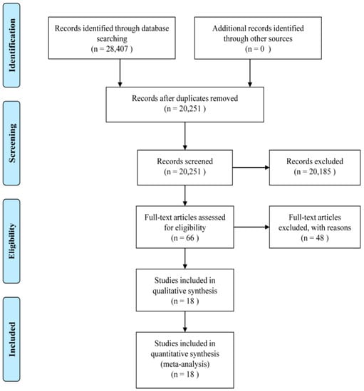 A total of 28,407 articles were identified in PubMed, Web of Science, and the Cochrane library. Duplicates (n = 8156), articles lacking information (n = 44), articles which were not original studies (n = 4065), articles not involving human participants (n = 8787), and articles unrelated to the topic of this study (n = 7288) were excluded. Among the 66 remaining studies, those with overlapping datasets (n = 6), those without RR or HR and 95% CI (n = 3), and those that were not prospective cohort studies (n = 39) were excluded. Overall, 18 articles were included in this meta-analysis (Figure 1).