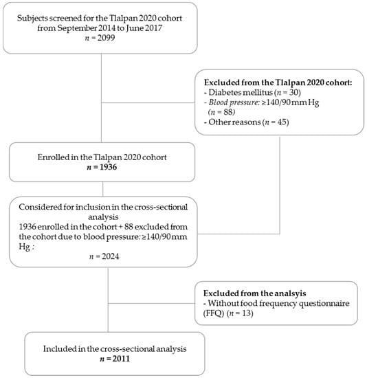 This cross-sectional analysis was based on baseline data from participants enrolled in the Tlalpan 2020 cohort, which is an ongoing observational, prospective, longitudinal study of risk factors for hypertension incidence in a population of adults aged 20–50 years old living in Mexico City. This study is being conducted by the Instituto Nacional de Cardiología Ignacio Chávez (INCICh) [National Institute of Cardiology Ignacio Chávez]; enrolment started in September 2014. Subjects with systolic blood pressure (SBP) ≥ 140 mm Hg and/or diastolic blood pressure (DBP) ≥ 90 mm Hg, diabetes mellitus, dysthyroidism, cerebrovascular disease, ischemic cardiomyopathy, acute coronary syndrome, active cancer with an effect on survival, cognitive or mental disability, pregnant women, and those taking medications that modify blood pressure, or with any other condition which, in the opinion of the researchers, could preclude compliance with the protocol, were excluded from the cohort. Methodology details of the Tlalpan 2020 cohort were published elsewhere []. For the purpose of this cross-sectional analysis, participants recruited in the cohort between September 2014 and June 2017 were included. Also, individuals who were screened but excluded from the Tlalpan 2020 cohort due to hypertension (SBP ≥ 140 mm Hg and/or DBP ≥ 90 mm Hg) were included in the present analysis in order to capture a wider range of blood pressure levels among participants. Individuals with incomplete dietary data were excluded from this sub-analysis. All participants gave their written informed consent to be recruited in the cohort. The study was conducted in accordance with the Declaration of Helsinki, and the protocol was approved by the Institutional Bioethics Committee of the INCICh (REF. 13-802).