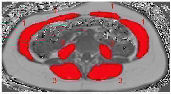 Representative segmentation of the abdominal muscles, psoas muscle, and erector spinae muscle in the proton density fat fraction (PDFF) map of a 40-year-old woman. The rectus abdominis muscle and internal oblique muscle (1), psoas muscle (2), and erector spinae (3) are segmented at the level of L4.