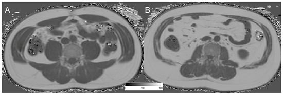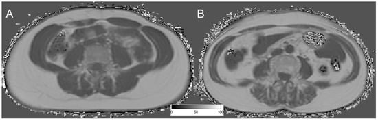 The average PDFF of the erector spinae muscle was 7.99 ± 6.36% (range: 3.32–34.29%) in men and 14.87 ± 6.74% (range: 0.71–31.34%) in women (p = 0.011). No significant differences between men and women, regarding PDFF, could be detected in the psoas muscle (p = 0.650) and abdominal muscles (p = 0.262). However, all muscular compartments showed significant differences in CSA (p < 0.0001) (Table 1). Representative PDFF maps of the abdominal muscles, psoas muscle, and erector spinae muscles from men and women are shown in Figure 2 and Figure 3.