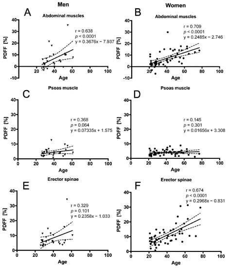 Proton density fat fraction (PDFF) of the abdominal muscle compartments. This figure plots the PDFF of the abdominal muscle, psoas muscle, and erector spinae against age for men (A,C,E) and women (B,D,F), respectively. The areas between the dotted lines represent the 95% confidence band of the best-fit line. Triangles represent x/y values for men and dots for women.