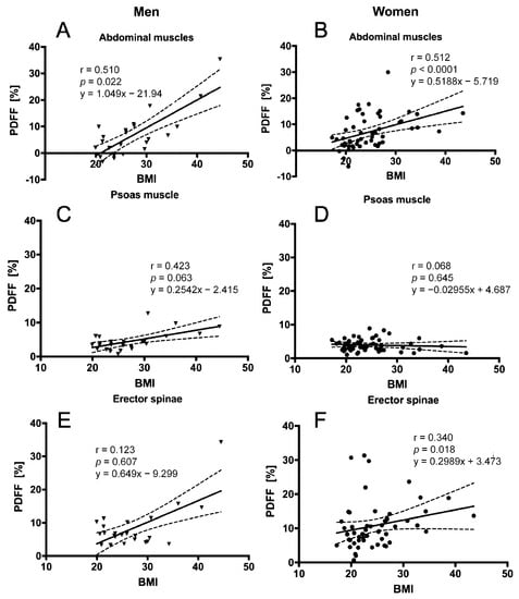 When performing partial correlation testing with age as a control variable, statistical significance was preserved for BMI versus abdominal muscle PDFF in men and women (men: r = 0.510, p = 0.022; women: r = 0.308, p = 0.014) (Table 6 and Table 7).