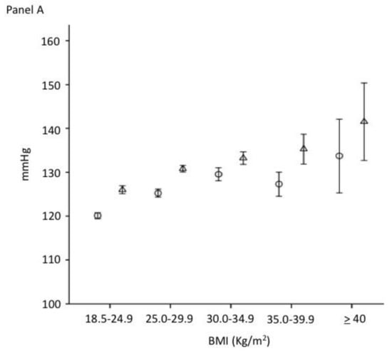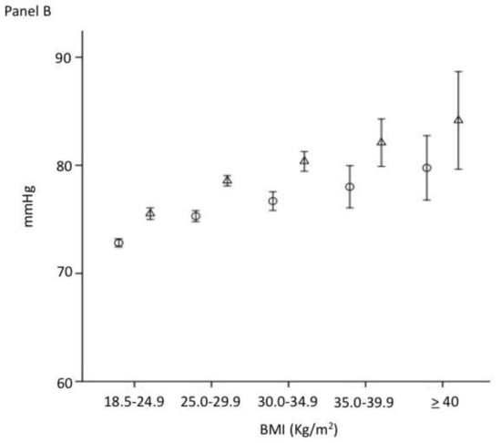 Systolic (panel A) and diastolic (panel B) blood pressure (mean and SD) according to the BMI levels (○: women; △: men) (p for trend < 0.001).