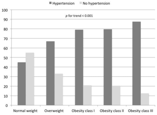 According to the BMI cutoffs recommended by the WHO, overweight status was observed among 2896 (38%) participants; the obesity status was identified in 1135 participants (15%), with 893 (11.8%) participants in class I, 186 (2.5%) in class II, and 56 (0.7%) in class III. As shown in Figure 2, the prevalence of hypertension significantly increased with the increase in BMI. Among participants with a normal BMI, the prevalence of hypertension was 45% compared to 67% among overweight participants, 79% in obesity class I and II, and up to 87% among participants with obesity class III (p for trend < 0.001).