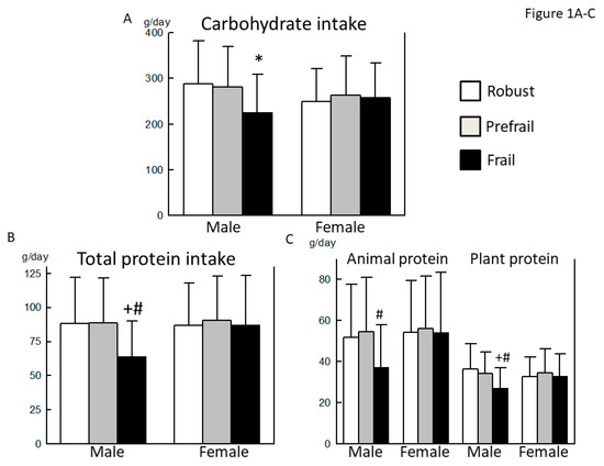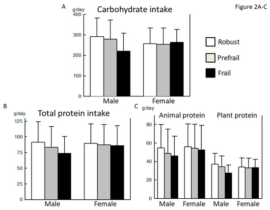 The carbohydrate, total protein (both animal and vegetable) and fat (both animal and vegetable) intake in the frail male group was the lowest among the three groups (Figure 1A–E). In addition, the intake of dietary fiber, both soluble and insoluble, was the lowest in the frail male group (Figure 1F). Among various nutrients, the intakes of sodium, potassium, calcium, magnesium, phosphorus, iron, zinc, α-tocopherol, vitamins B1 and B2, and pantothenic acid were the lowest in the frail male group (Table 2). The intake of copper, β-carotene (equivalent), γ-tocopherol, vitamins B6, C, and K, folate, and cryptoxanthin were lower in the frail male group than in the robust male group. In terms of food groups, the intake of sugar and sweeteners, and dairy products was significantly lower in the frail male group than in the prefrail male group.