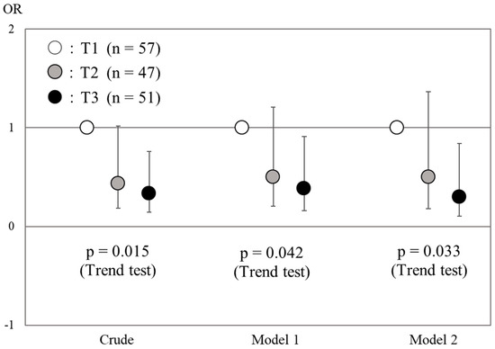 In multivariate logistic regression, an association between the Food Guide score and sleep quality was confirmed with covariate adjustment (Figure 1). Univariate analysis showed that the OR (95% CIs) for the highest tertile versus the lowest was 0.33 (0.15–1.76) (p for trend = 0.015). In addition, after adjustment for age, sex, BMI, current drinker, current smoker, and residential status, the ORs (95% CI) were 0.50 (0.21–1.21) and 0.38 (0.16–0.91) for the T2 and T3 groups, respectively (p for trend = 0.042). Moreover, after adjustment for model 1 plus the CES-D score, MEQ score, PALs, and energy intakes, the significant association between the Food Guide score and sleep quality did not disappear (p for trend = 0.033). On the other hand, when we used the PSQI score as a continuous variable in model 3, there was no statistically significant association between the Food Guide score and the PSQI score (p = 0.167). In addition, because a significant association was found between the Food Guide score and the MEQ score (Table 3), we confirmed the additional analysis using the MEQ score and the Food Guide score as a dependent and independent variable, respectively. As a result, a higher Food Guide score was also significantly associated with a higher MEQ score (p = 0.026).