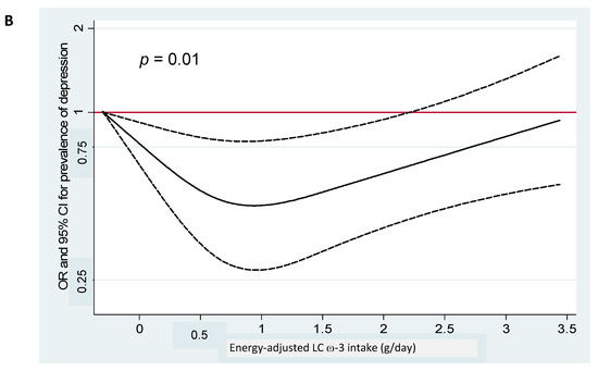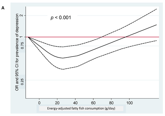 Spline regression models. (A) Spline regression model of the odds ratio of depression according to fatty fish consumption (the dotted lines represent 95% CI). (B) Spline regression model of the odds ratio of depression according to LC ω-3 PUFA intake (the dotted lines represent 95% CI).