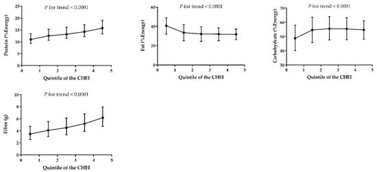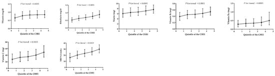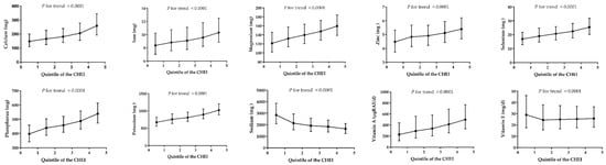 Figure 2 and Figure 3 shows the distribution of macronutrients and selected micronutrient intakes (after energy adjustment) across the CHEI quintile scores, respectively. The CHEI score was positively associated with protein, carbohydrate and fiber, but negatively associated with fat (P for trend <0.0001). For all the minerals except sodium, significant positive trends (P < 0.0001) were observed across quintiles of the CHEI score. Of the vitamins, only vitamin E showed an inverse association with the CHEI; the other vitamins were all positively associated with the increase of the CHEI. The results of nutrients distribution, as shown in Supplemental Figure S1, were consistent before and after the energy adjustment. Additionally, the increasing CHEI score was also linked with a higher score of the Nutrient-Rich Foods (NRF) 9.3 index, which was a tool to measure the nutritional quality of diets [].