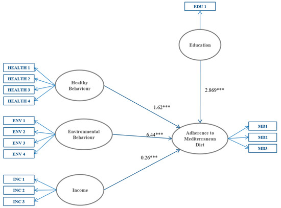 Structural equation model between healthy behaviors, environmental behaviors, income education, and the adherence to Mediterranean diet. Notes: Ovals represent the latent variables, whilst measured variables are indicated in rectangles. The path coefficients of each arrow can be interpreted as common regression weights. *** indicate significance at 0.001 level. MD1: food consumption; MD2: fat and salt consumption; MD3: drink consumption; HEALTH 1: physical activity; HEALTH 2: weight check; HEALTH 3: smoking behavior; HEALTH 4: breakfast habit; ENV 1: attention not to throw rubbish on the street; ENV 2: attention not to waste water; ENV 3: attention not to waste energy; ENV 4: attention to recycling; INC 1: comparison with the economic condition of the previous year; INC 2: evaluation of the household economic condition.