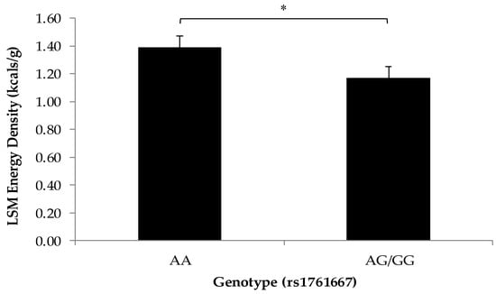 Least squares means of energy density of snacks by rs1761667 genotype Statistical differences between the total energy density of snacks by genotypes for rs1761667 of the CD36 fat taste receptor gene were determined using generalized estimating equations (n = 47; * p = 0.007) and a recessive genetic model [6]. Children carrying the AA genotype (n = 13), predicted to prefer fat more than the AG/GG genotypes (n = 34), consumed snacks with a higher total energy density than children carrying the G allele. Values are reported as least squares means + SE.