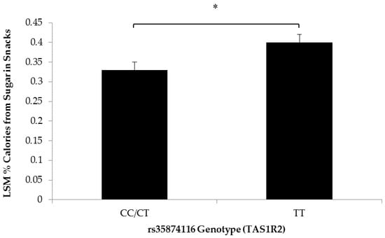 Least squares means of the percent calories from sugar in snacks by rs35874116 genotype Statistical differences between the relative calories from sugar in snacks for rs35874116 of the TAS1R2 sweet taste receptor gene were determined using generalized estimating equations (n = 47; * p = 0.008) and a dominant genetic model [20]. Children carrying the TT genotype (n = 25), predicted to prefer sweet, consumed snacks with significantly more calories from sugar than carriers of the C allele (n = 22). Values are reported as least squares means + SE.