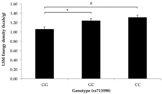 Least squares means of total energy density of snacks by rs713598 genotype Statistical differences between the total energy density of snacks by genotypes for rs713598 of the TAS2R38 bitter taste receptor gene were determined using generalized estimating equations (n = 47; * p = 0.01, # p = 0.001) and an additive genetic model [34]. Children carrying the CC (n = 12) or CG (n = 27) genotypes consumed snacks with an overall higher energy density than the children carrying the GG genotype (n = 8). Values are reported as least squares means + SE.