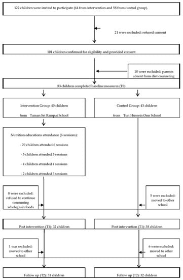 The inclusion criteria were: (1) apparently healthy Malaysian schoolchildren aged 9–11 years and studying in Year 4 or Year 5; (2) children who were overweight or obese; (3) able to read, write and understand Malay and (4) at least one parent who perceived that their child has a weight problem and who is willing to attend the individual diet counseling. Children were excluded if: (1) they have a serious co-morbidity requiring treatment or were on gluten-free diet and (2) any of their three-day 24-h diet-recall during screening indicated that they had consumed whole-grain food.