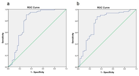 Area-under-the-responder-operator-curves (AUROC) representation of NAFLD prediction by FLI (a) and NAFLD-LFS (b); both analyses show a significant prediction with AUROC values of 0.786 (FLI) and 0.775 (NAFLD-LFS).
