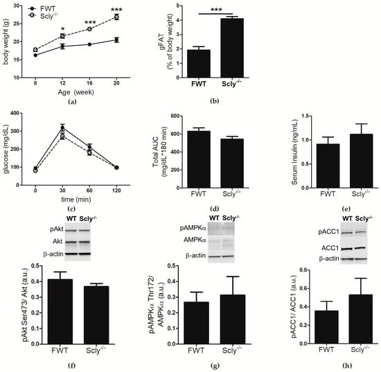 We previously reported that male Scly−/− mice develop a metabolic syndrome-like phenotype that is exacerbated when Se supply is limited [1]. Female Scly−/− mice exhibited a milder phenotype, and thus were not extensively characterized in the previous study after initial cursory examination. In the present study, female Scly−/− and WT mice were fed a low Se diet from weaning to 20 weeks of age, and analyzed for effects of Se deficiency on metabolic phenotype. At 8 weeks of age, the body weights of female Scly−/− mice were not distinct from their WT counter parts. A time course assessment of body weight revealed a main effect of genotype and time. Post hoc analysis showed that by 12 weeks of age, female Scly−/− mice were significantly heavier than their WT counterparts, a trend that persisted up to at least 20 weeks of age (Figure 1a). This time point was chosen because symptoms of metabolic syndrome in male Scly−/− mice begin to appear by 20 weeks of age. Female Scly−/− mice also had a significantly higher percentage of gonadal fat deposition (Figure 1b). We administered an intravenous glucose tolerance test, but found no differences in glucose clearance (Figure 1c,d), further confirming that female Scly−/− mice are insulin sensitive. In contrast to what was previously observed in male Scly−/− mice [1], fasting insulin levels were similar in female Scly−/− and WT mice (Figure 1e). Next, we subjected 22-week-old mice to a 4-hour fast, followed by insulin challenge. We found no changes in phosphorylated Akt at serine 473 (pAkt Ser473), a major mediator of insulin signaling (Figure 1f). No differences were observed in phosphorylated AMP-activated protein kinase alpha at threonine 172 (pAMPKα Thr172; Figure 1g) or phosphorylated acetyl-CoA carboxylase (pACC1; Figure 1h), major regulators of lipid and cholesterol metabolism. Taken together, our results demonstrate that, similar to their male counterparts, maintenance of female Scly−/− mice on a low Se diet results in increased adiposity, but unlike males, female Scly−/− mice do not develop hyperinsulinemia, reduced glucose tolerance, downregulated insulin signaling, or activated de novo lipogenesis.