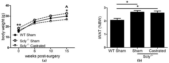 The effects of castration on body and fat weight. Unless indicated, metabolic parameters were measured in mice that were 20–22 weeks of age. For WT sham-operated mice: n = 6, Scly−/− sham-operated mice: n = 8, Scly−/− castrated mice: n = 6. (a) Body weight at the indicated time points after surgery. One-way ANOVA was used to test each time point (6 weeks: F2,17 = 5.88, p = 0.01; 10 weeks: F2,17 = 14.0, p = 0.0003; 15 weeks: F2,17 = 18.66, p < 0.0001) and Dunnett’s post-test was used to compare all groups to WT (WT vs. sham: ^ p < 0.05, WT vs. castrated: * p < 0.05, ** p < 0.01); (b) inguinal WAT (iWAT) depots displayed as % of bodyweight (one-way ANOVA: F2,17 = 5.94, p = 0.01). All data are represented as means ± S.E.M.