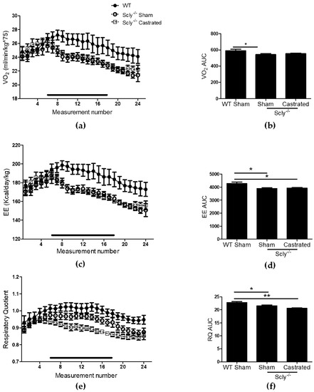 Indirect calorimetry revealed significant differences in VO2 when comparing WT to Scly−/− sham-operated mice and a similar trend when comparing WT to castrated mice, although values did not reach significance (Figure 3a,b). Both groups of Scly−/− mice had decreased energy expenditure (Figure 3c,d) and respiratory quotient (RQ; Figure 3e,f) when compared to WT.