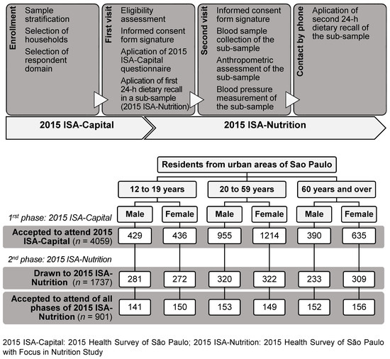 Of those who agreed to participate in the 2015 ISA-Capital (n = 4059), 1737 individuals were randomly selected to the 2015 ISA-Nutrition, and they answered the first 24-h dietary recall (24HR) (Figure 1). These participants were invited to take part in the second phase of the survey, and 901 individuals agreed to have their blood sample collected, undergo anthropometric and blood pressure assessments, and answer the second 24HR.