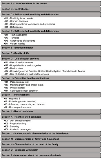 - Szwarcwald, C.L.; Malta, D.C.; Pereira, C.A.; Vieira, M.L.F.P.; Conde, W.L.; Souza Junior, P.R.B.D.; Damacena, G.N.; Azevedo, L.O.; Azevedo E Silva, G.; Theme Filha, M.M.; et al. National Health Survey in Brazil: Design and methodology of application. Cienc. Saude Colet. 2014, 19, 333–342. [Google Scholar] [CrossRef]