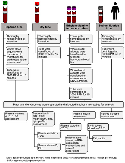 The blood samples were collected after 12 to 14 h of fasting and were sent to the Laboratory of Nutritional Genomics and Inflammation of the Public Health School of the University of São Paulo, in Styrofoam boxes containing recyclable ice. Standardized specific procedures were then performed (Figure 3). Nine aliquots, per participant, were immediately forwarded to the laboratory for analysis. Approximately 25 aliquots were stored according to the requirements for each dosage at −20 °C or −70 °C. The baseline laboratory measurements used in the 2015 ISA-Nutrition are shown in Table 1.
