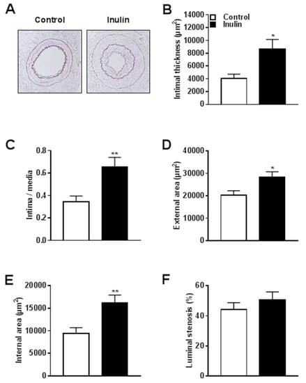 Inulin increased atherosclerotic lesion formation and outward vascular remodeling. (A) Representative cross-sections of the cuffed femoral arteries of E3L mice stained with Weigert’s elastin staining visualizing the elastic laminae; (B) Quantification of intimal lesion thickening; (C) Intima/media ratio; (D) External surface area; (E) Internal surface area; and (F) Percentage of luminal stenosis. Values are presented as means ± SEM (n = 11–13 mice per group). * p < 0.05, ** p < 0.01 vs. control.