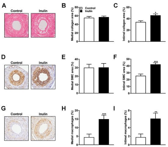 Representative cross-sections of the cuffed femoral arteries stained for collagen are shown for both the control and the inulin group (Figure 3A). Inulin did not affect medial collagen area (Figure 3B), but increased the intimal collagen area (+35% vs. control; p = 0.01; Figure 3C). Figure 3D shows representative cross-sections of the cuffed femoral arteries stained for SMCs in both intervention groups. Likewise, inulin did not affect SMCs in the medial area (Figure 3E), but increased the area of intimal SMCs (+66% vs. control; p = 0.001; Figure 3F). Representative cross-sections stained for macrophages are shown in Figure 3G. Inulin substantially increased the intensity stained for macrophages of both the medial area (+247% vs. control; p = 0.001; Figure 3H) as well as the intimal lesion area (+259% vs. control; p = 0.002; Figure 3I). These data showed that inulin adversely affected lesion composition in hypercholesterolemic mice after perivascular cuff placement.