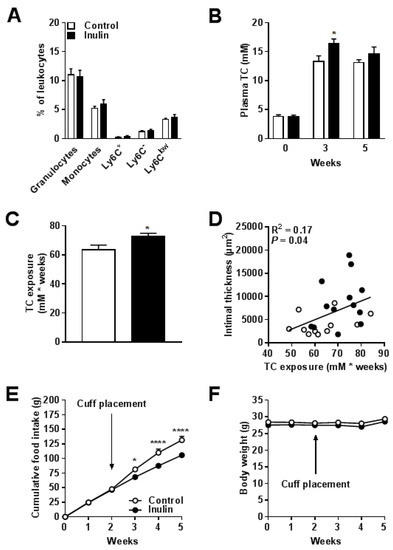 Inulin did not affect blood monocyte composition but increased total cholesterol exposure. (A) Circulating granulocytes, monocytes, and monocyte subsets Ly6C+, Ly6Clow, and Ly6C- are shown as a percentage of circulating leukocytes; (B) Plasma TC was analyzed in week 0, 3, and 5; and (C) Cumulative TC exposure was calculated over the entire intervention period of 5 weeks; (D) TC exposure was plotted against intimal thickness; (E) Cumulative food intake and (F) Body weight over the 5-week intervention period. The arrow indicates the time point at which the cuff was placed around the femoral artery. Values are presented as means ± SEM (n = 11–13 mice per group). * p < 0.05 vs. control.