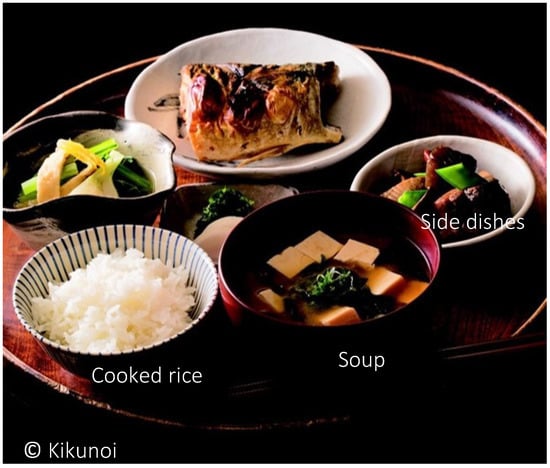 The traditional dietary cultures of Japan are collectively known as Washoku. In 2013, Washoku was named in the UNESCO list of Intangible Cultural Heritage. According to Professor Kumakura Isao, the President of the National Assembly on the Preservation and Continuation of Washoku culture, the guiding principles of Washoku are a staple food—rice—which is complemented by a variety of side dishes, soup, and pickles. Together these form the basic structure of a meal, customarily eaten using chopsticks, wooden bowls known as “wan”, and the like (Figure 1, Table 1). This menu benefits fully from the distinctive flavor (combination of taste, smell, and tactile sensations) of each ingredient.