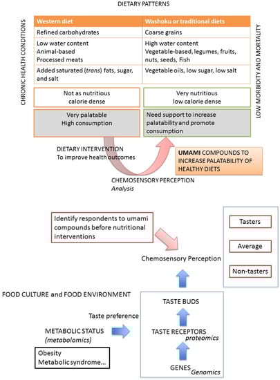 In this article, we put forward an argument that Japanese traditional diet practices (Washoku), which prominently include the flavoring of foods with umami taste, can be characterized as a healthy diet in the same way that the DASH diet or the Mediterranean diet is so classified (summary in Figure 2). We then discussed the importance of taste in guiding food choice and the important role that genetically-based individual differences in taste perception can have on a person’s food selection behavior. We hope that several of the principles of Washoku will be studied and adopted by physicians, nutritionists, dieticians and others engaged in encouraging healthful eating.