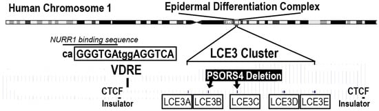 - Bergboer, J.G.; Tjabringa, G.S.; Kamsteeg, M.; van Vlijmen-Willems, I.M.; Rodijk-Olthuis, D.; Jansen, P.A.; Thuret, J.Y.; Narita, M.; Ishida-Yamamoto, A.; Zeeuwen, P.L.; et al. Psoriasis risk genes of the late cornified envelope-3 group are distinctly expressed compared with genes of other LCE groups. Am. J. Pathol. 2011, 178, 1470–1477. [Google Scholar] [CrossRef] [PubMed]