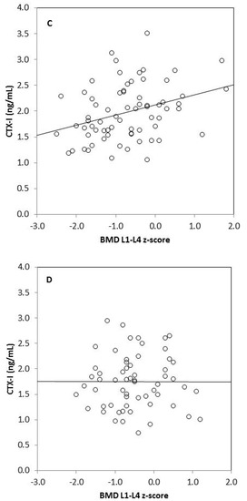 Analyzing correlations between biochemical markers and anthropometric parameters, we found that serum CTX-I was significantly correlated with BMC in the total body and in the spine and with BMD (total as well as lumbar spine) in vegetarians. Additionally, in this group of children, we observed a weak correlation between spine BMC and serum BALP as well as OPG levels. It is worth noting that we did not find such associations in children on an omnivorous diet. Moreover, only in vegetarians, we found significant associations between bone metabolism markers: CTX-I and BALP, CTX-I and sclerostin, and between BALP and OPG.