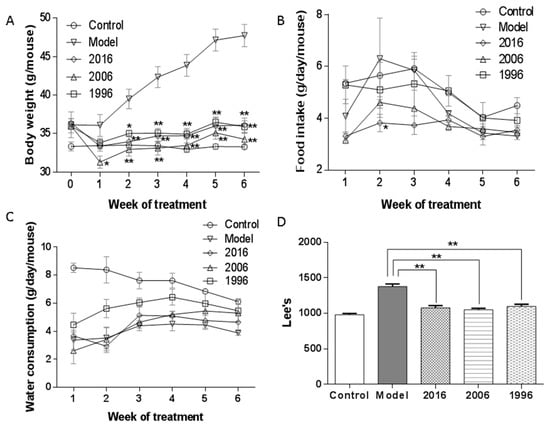 Effects of EAOT treatment on (A) body weight; (B) food intake; (C) water consumption; and (D) Lee’s index. During 6 weeks of different storage years of EAOT treatment, body weights, food intake, and water consumption were recorded once a week. After 6 weeks of administration, Lee’s index was measured. Data were mean ± SEM (n = 9). * p < 0.05 versus model; ** p < 0.01 versus model.
