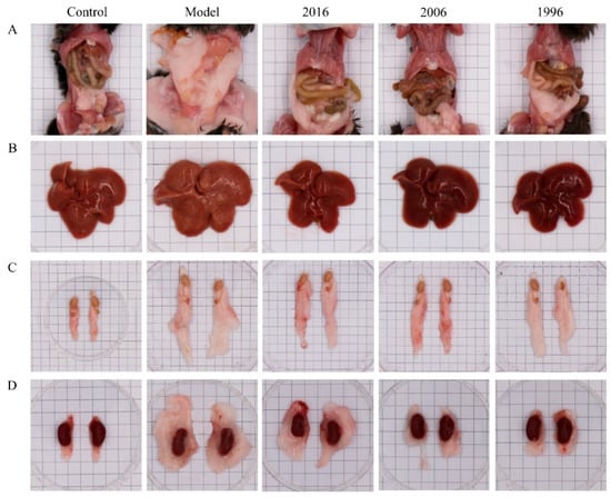 The effects of EAOTs on fat accumulation were studied by anatomic observation and by analyzing the organ index of white adipose tissues. Gross observation revealed that the mice in the model group showed a large accumulation of white fat, while it decreased markedly after being treated with EAOTs, especially in the 2006 group (Figure 2A). In Figure 2B, the model group mice had developed fatty livers. Their liver sizes were larger than those of the control group. They also became yellow-brown and the liver surfaces were uneven, whereas the liver changes of mice treated with EAOTs were equal to those of the control mice. Moreover, EAOTs greatly decreased the size of epididymal and pararenal adipose tissue masses (Figure 2C,D).