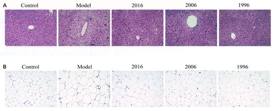 After a week of adaptation, 45 C57BL/6J were randomly divided into five groups as follows: (i) the control group (n = 9); (ii) the group fed an HFD (Model) (n = 9); (iii) the group fed an HFD and 1000 mg/kg·BW EAOTs stored in 2016 (2016) (n = 9); (iv) mice fed an HFD and 1000 mg/kg·BW EAOTs stored in 2006 (2006) (n = 9); and (v) the group fed an HFD and 1000 mg/kg·BW EAOTs stored in 1996 (1996) (n = 9). Control mice were fed a normal diet (containing protein 18%, fat 4%, carbohydrate 62%, fiber 5%, minerals 8%, and vitamins 3%, w:w; Beijing Huafukang Bioscience Co., Ltd., 1022), and mice in the other four groups were fed an HFD (45% calories from fat, 20% calories from protein, 35% calories from carbohydrate; Beijing Huafukang Bioscience Co., Ltd., H10045) for 18 weeks, during which time all mice were not administered EAOTs.