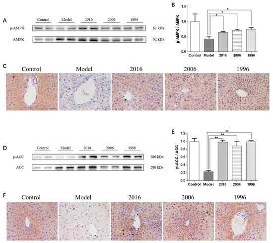 EAOTs activate AMPK and ACC phosphorylation. (A) Western blotting analysis of AMPK protein levels in mice liver and (B) densitometric quantification of them (n = 3 independent experiments); (C) Immunohistochemical staining of liver for p-AMPK; (D) Western blotting analysis of ACC protein levels in mice liver and (E) densitometric quantification of them (n = 3 independent experiments); (F) Immunohistochemical staining of liver for p-ACC. The scale bar represents 20 μm. Each value represents the mean ± SD (n = 9); * p < 0.05 versus model; ** p < 0.01 versus model.