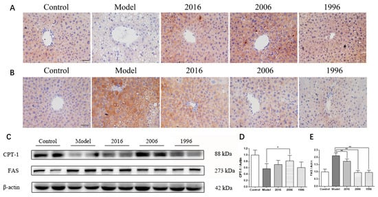 Moreover, FAS, which enhances fat synthesis, was down-regulated in the EAOT groups, particularly in the 2006 and 1996 groups (Figure 5C). Consistently, the model group revealed intense staining around the lipid inclusions in comparison to the control groups, and EAOTs were able to significantly reduce FAS expression (Figure 5B). All these data indicate that EAOTs might alleviate HFD-induced metabolic abnormalities, at least in part, through regulating the expression of a certain set of metabolic proteins.