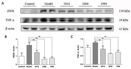 Obesity is usually associated with a large number of inflammatory cells and factors. Severe inflammation can aggravate the liver injury, cause the decline of liver function, and weaken the glucolipid metabolism ability and lipid metabolism []. As shown in Figure 6A, the protein expression of iNOS and TNF-α in livers of the model group mice showed a marked increase compared to those of the control group, while the treatment groups had a lower iNOS and TNF-α protein expression level in the liver than those in the model group. Especially in the 2006 group, the expression levels decreased markedly compared to the model group. These results showed that EAOTs can relieve liver inflammation to a certain degree by inhibiting inflammation factors, iNOS and TNF-α.