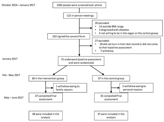 The study was conducted between October 2016 and June 2017 in Washington, DC, using a single-center, randomized, open parallel study. Men and women, aged 25 to 75 years, with a body-mass index between 28 and 40 kg/m2, were enrolled. Exclusion criteria were history of diabetes, smoking, alcohol or drug abuse, pregnancy or lactation, and current use of a vegan diet. The study protocol was approved by the Chesapeake Institutional Review Board on 12 October 2016. The protocol identification number is Pro00018983. All participants gave written informed consent. Trial Registration: ClinicalTrials.gov number, NCT02939638.