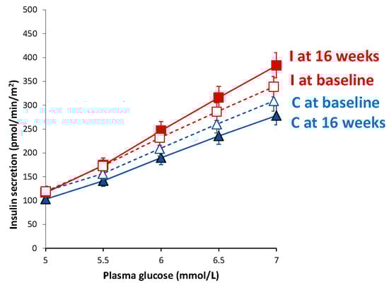 Dose-response insulin secretion in response to different plasma glucose levels. Triangles with the blue line represent the control group (empty triangles and a dashed line at baseline, and full triangles with a full line at 16 weeks), while squares with the red line show data from the intervention group (empty squares with a dashed line at baseline, and full squares with a full line at 16 weeks). Data are given as means with 95% CIs.