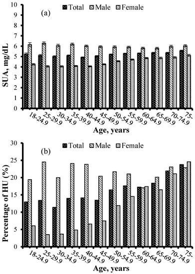 SUA concentrations (a) and crude prevalence of HU (b) for 7946 participants according to their age and gender. Data of SUA concentrations were expressed as means ± standard error (SE). SUA, serum uric acid; HU, hyperuricemia.