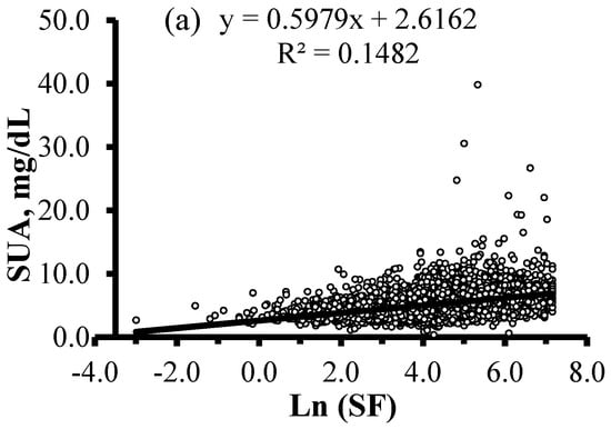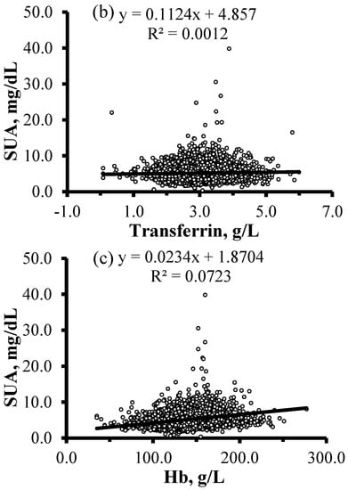 Correlations between SUA concentrations and levels of ln(SF), transferrin, and Hb in 7946 adult participants. (a) Positive correlation between ln(SF) and SUA (r = 0.385, p < 0.001); (b) positive correlation between transferrin and SUA (r = 0.035, p = 0.002); (c) positive correlation between Hb and SUA (r = 0.269, p < 0.001). SUA, serum uric acid; SF, serum ferritin; Hb, hemoglobin.