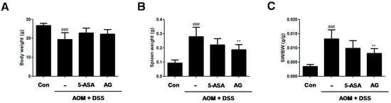 Effect of AG on body weight and spleen weight in AOM/DSS-induced mice. (A) Body weight; (B) spleen weight; and (C) spleen weight (SW)/body weight (BW) were measured at last day of AOM/DSS-treated experiments. Values represent mean ± S.D. of three independent experiments. ### p < 0.001 vs. the control group; ** p < 0.01 vs. the AOM/DSS group; significances between treated groups were determined using ANOVA and Dunnett’s post hoc test. Con = Control.