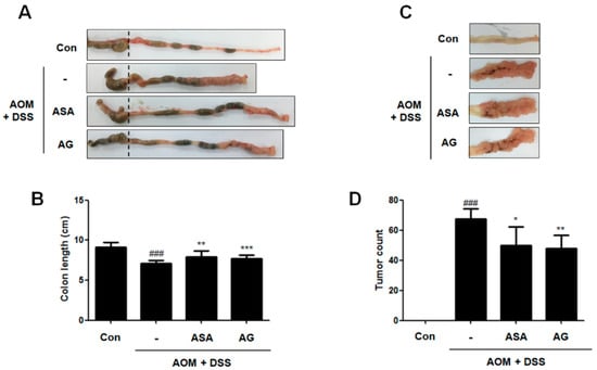 Inhibitory effect of AG on tumor progression in AOM/DSS-exposured mice. (A) Colons were obtained on the last day of AOM/DSS administration; and (B) colon lengths; and (C,D) number of macroscopic tumors were measured. Values represent mean ± S.D. of three independent experiments. ### p < 0.001 vs. the control group; * p < 0.05, ** p < 0.01 and *** p < 0.001 vs. the AOM/DSS group; significances between treated groups were determined using ANOVA and Dunnett’s post hoc test.