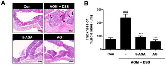 Histological analysis confirmed that the AOM/DSS group had crypt destruction (white arrows) and even large adenocarcinomas (black arrows) in some specimens (Figure 4A). In contrast, 5-ASA or AG-treated groups indicated a marked reduction of these symptoms. It is reported that colonic smooth muscle thickness was used to estimate inflammation in the gastrointestinal tract [12]. As shown in Figure 4B, compared to the control group, the AOM/DSS-induced group revealed an increase of colonic muscle thickness (76.15 ± 12.21 μm vs. 237.85 ± 28.73 μm, p < 0.001). However, treatment with 5-ASA or AG significantly ameliorated the elevated muscle thickness caused by the AOM/DSS treatment; vehicle-treated mice with AOM/DSS versus 5-ASA (75 mg/kg)-treated mice with AOM/DSS (237.85 ± 28.73 μm vs. 90.77 ± 11.30 μm, p < 0.001) and vehicle-treated mice with AOM/DSS versus AG (25 mg/kg)-treated mice with AOM/DSS (237.85 ± 28.73 μm vs. 59.62 ± 13.14 μm, p < 0.001).