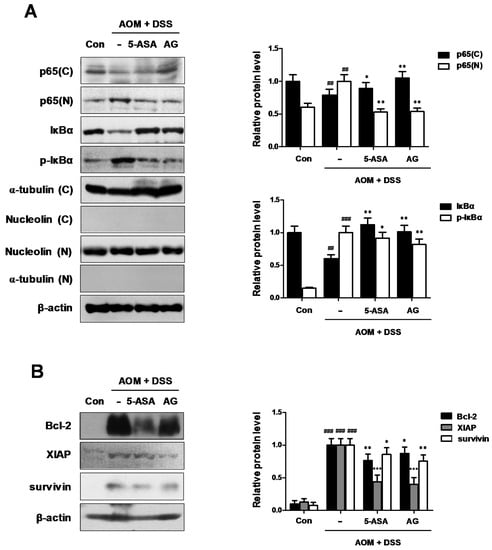 As the key components of inflammation include primary inflammatory cytokines, hematopoietic growth factors, and the master transcription factor NF-κB [14], we examined whether NF-κB was inhibited by AG in AOM/DSS-treated mice. As shown in Figure 6A, our results indicated that AG inhibited the nuclear translocation of NF-κB p65 protein in AOM/DSS-treated mice. We also found that AG inhibited the phosphorylation of IκBα and recovered the downregulated expression of IκBα. As NF-κB activation is important for the development of CAC, we next evaluated the expression of NF-κB-related proteins. AG and 5-ASA decreased the expression of NF-κB-related pro-survival genes, including Bcl-2, XIAP, and survivin (Figure 6B).